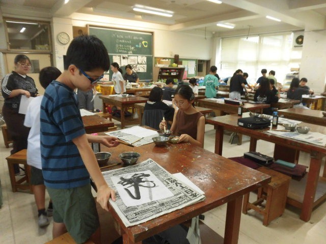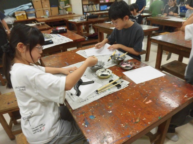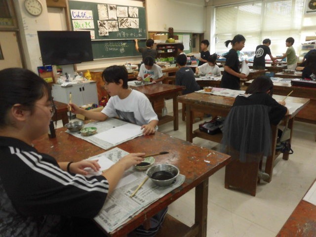 6年生の授業は図工です。墨、筆、半紙を使って絵を描いています。墨汁を水で薄め、濃淡を出しています。どのような作品になるのでしょう。楽しみです。