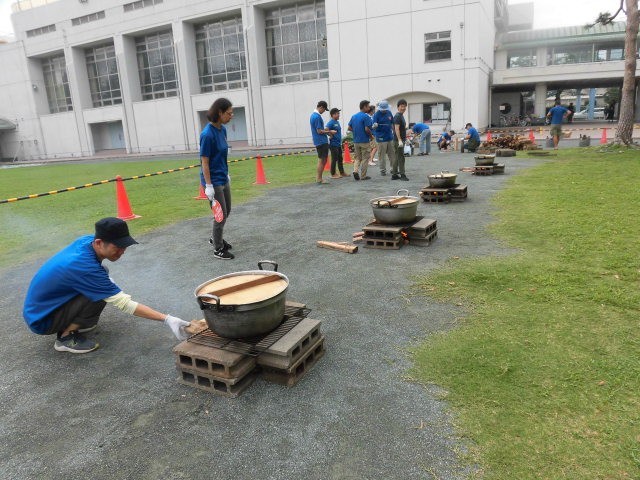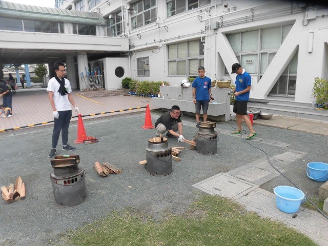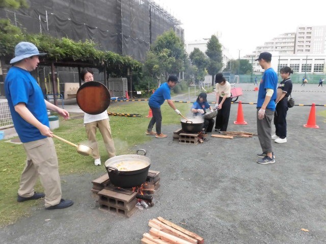 子どもたちが持ってきたカレーの材料でカレーライスづくりをしています。本来ならば子どもたちと一緒に作る予定でしたが、天候の関係で急きょ変更となっています。お父さんお母さん卒業生が、池尻小の子どもたちのために一生懸命に作ってくれています。