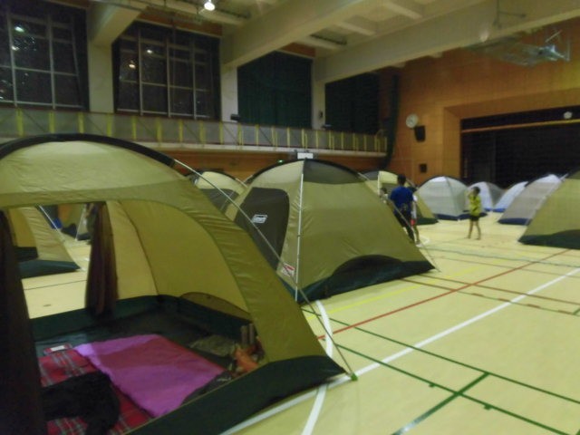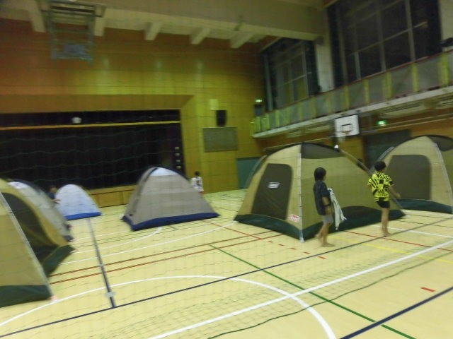 就寝前の子どもたちです。体育館にテントを張っての就寝に子どもたちはとてもワクワクしているようです。
