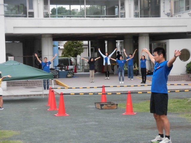 朝食の準備などいろいろなお仕事をしてくださっている88会の方々も一緒にラジオ体操をしました。