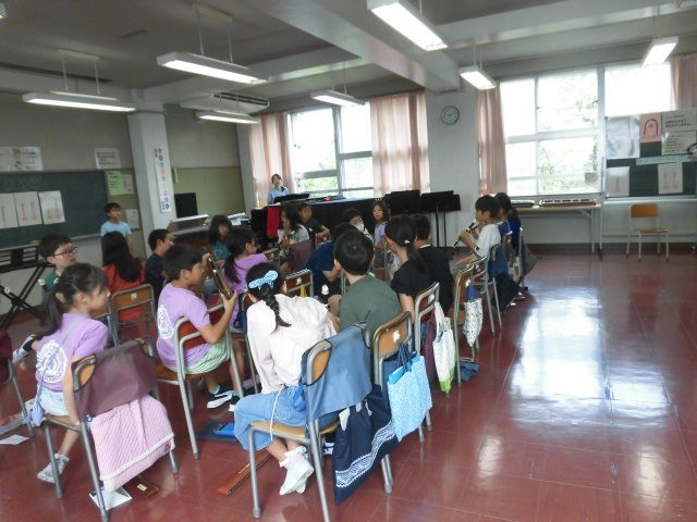 4年生の授業は音楽です。リコーダーの練習をしていました。「こきりこ」に出てくる音階の音の練習をしています。♭もあります。子どものころ、この♭の音がなかなか出せなかったことを思い出しました。
