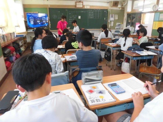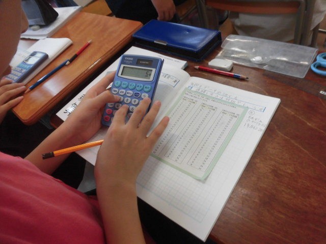 6年生の授業は算数です。データーの処理の学習をしています。たくさん並んだ数字を集計しています。計算機を使って、計算しています。「校長先生、もっといい計算機を買ってくださいよ。」そんなことを言う6年生もいました。