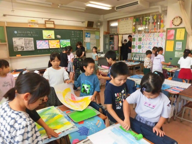 1年生の授業は図工です。ローラーを使った作品をつくっています。絵の具の濃さによって、ローラーでできる線に濃淡がうまれます。それが、とてもきれいです。子どもたちは楽しそうに画用紙の上でローラーを動かしていました。