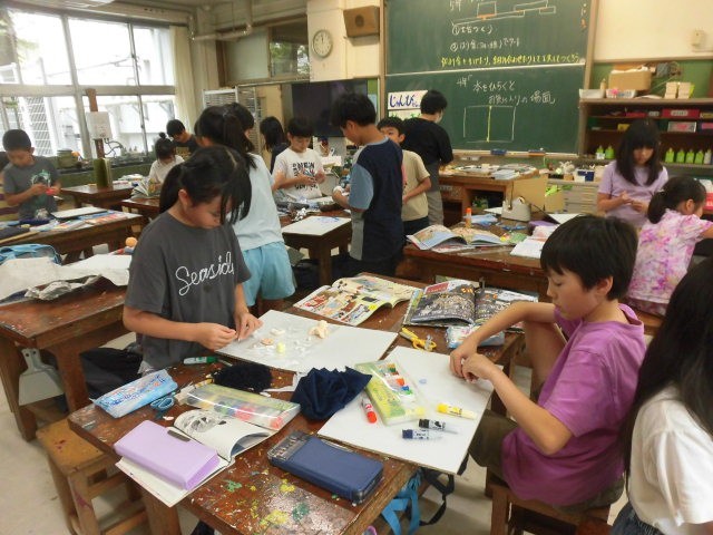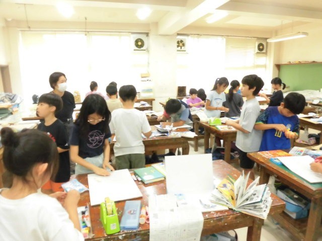 4年生の授業は図工です。「本をひらくとお気に入りの場面」と題して、選んだ本の気に入った場面の再現をしています。
