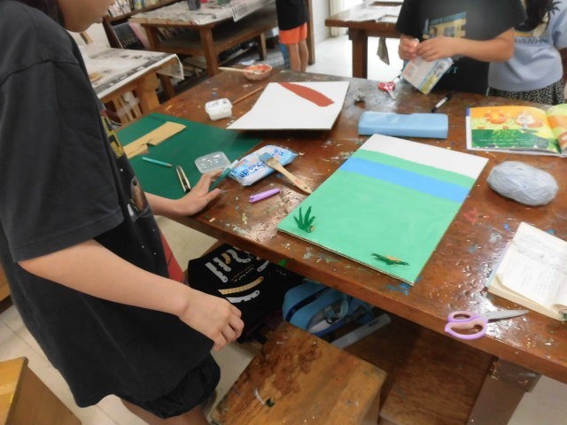 紙粘土で登場人物などを作る人、背景などを厚紙で作る人、毛糸を丸める人、子どもたちがやっていることはさまざまです。わたしだった、何の本のどんな場面を選ぶか考えてしまいました。