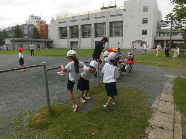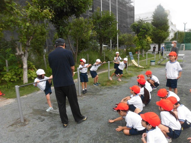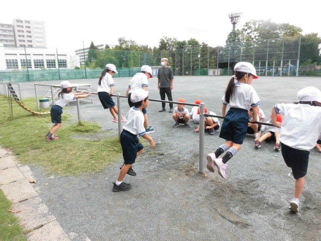 1年生の授業は体育です。鉄棒の授業です。つばめ、布団干し、こうもりなどを行っています。つばめの姿勢から後ろ側にとびおりることを楽しそうにやっている人がたくさんいました。