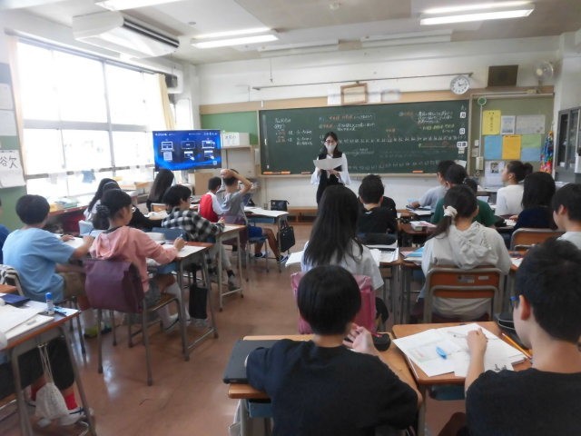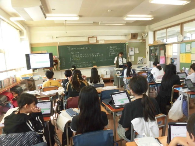 データーの処理の学習です。一つのクラスでは、新しく配られたタブレットを使って、ロイロノートの問題をみんなで解いています。早押しなどもあり、クイズ感覚でみんなで楽しく取り組んでいました。もう一つのクラスではワークシートを使って問題を解き、答え合わせをしていました。