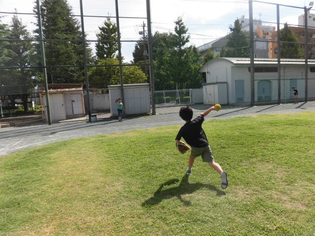 校庭のはじの方では、キャッチボールをしている人もいます。投げる球が速くてびっくりしました。