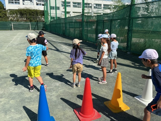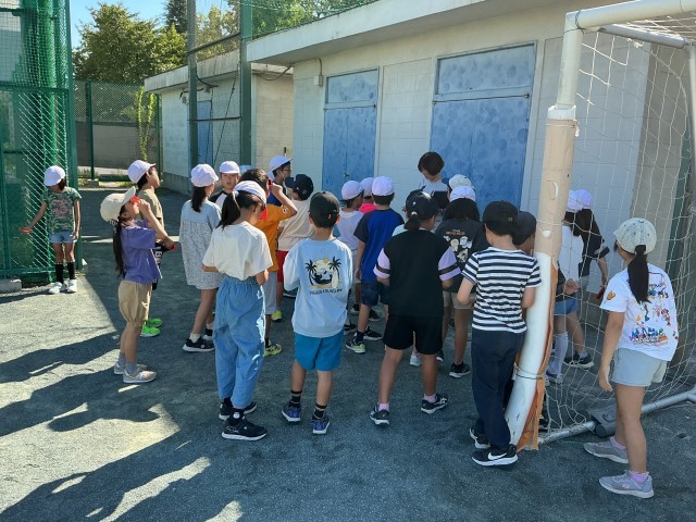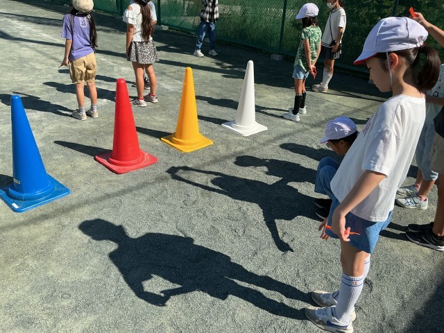 日なたと日かげの学習で、実際に校庭に出てかげのある場所、無い場所を調べました。