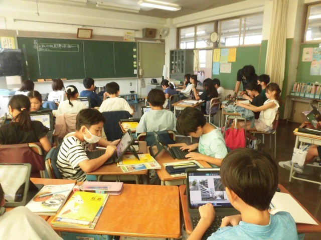 4年生の授業は社会です。水害に対しての東京都の取り組みをタブレットでまとめています。