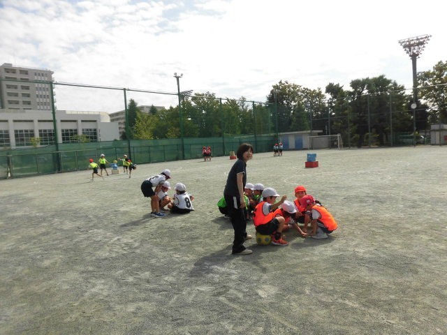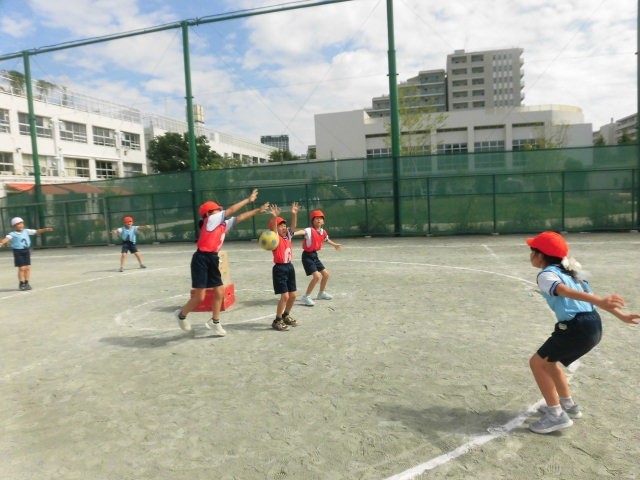 2年生の授業は体育です。攻守交替型の的あてゲームをしています。ゲームの合間には、作戦を話し合っています。得点が入らないように妨害している人は、的に当たらないように手を大きく広げています。みんな楽しそうにゲームをしています。