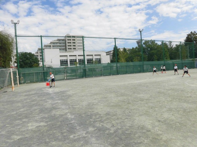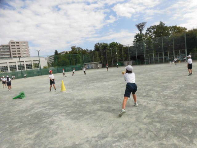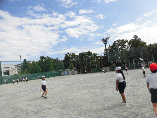 5年生の授業は体育です。ティーボールをしています。バットでボールを打っている人、二人組でキャッチボールをしている人などがいます。普段触ることの少ない小さなボールの扱いに困っている人がたくさんいるようです。小さいボールに触る経験が少ないのですね。