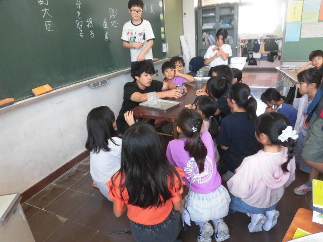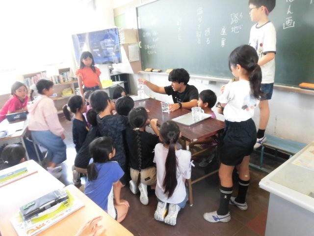 4年生の教室では、理科の実験結果の確認をしていました。日のあたるところに置いておいた水と日の当たらないところに置いてあった水の量の変化を調べています。水の量に大きな違いがあるようです。ラップをかぶせてあるものはどうなのでしょう。