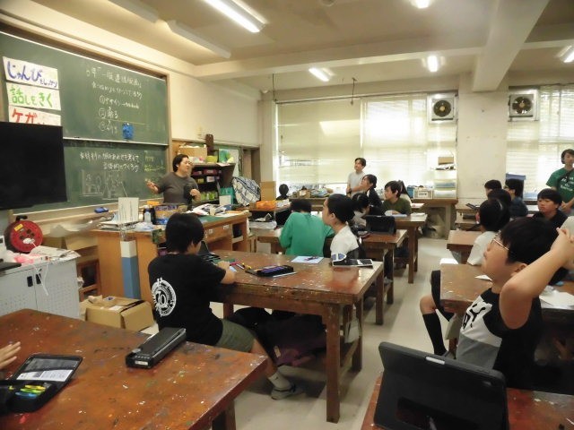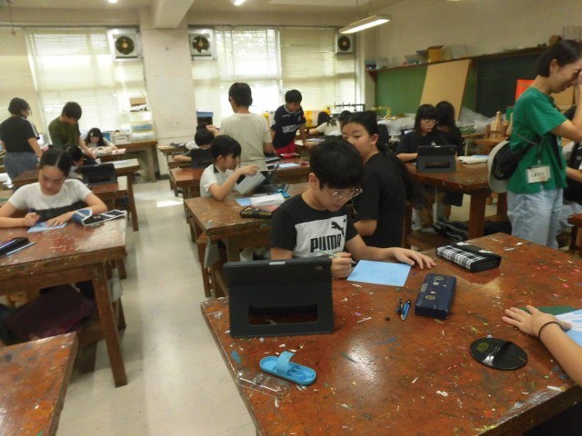 6年生の授業は図工です。版画の授業です。版を一つ作り、それを4枚連結させて作品を作ります。