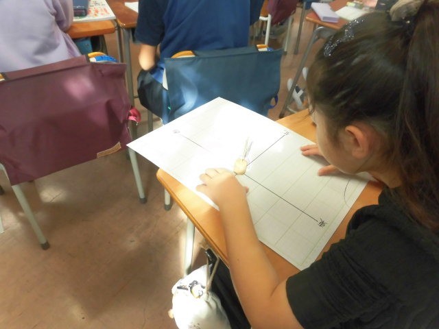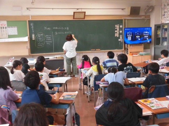 3年生の授業は理科です。「地面の様子と太陽」について学習しています。太陽の位置によって、できる影が異なります。それは、地面の様子と関係があるのでしょうか。子どもたちは、道具を使って校庭で計測した結果をもとに、教室で考えをまとめていました。