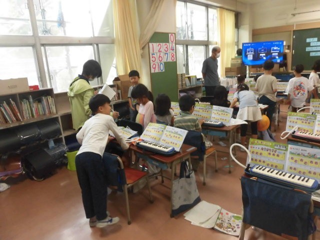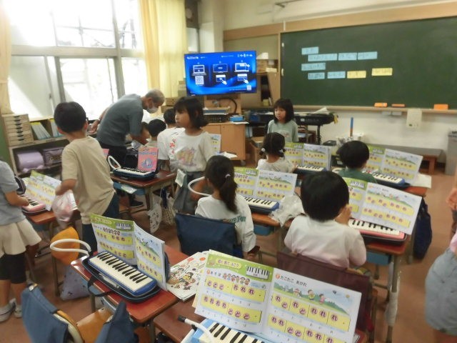 1年生の授業は音楽です。鍵盤ハーモニカの学習をしています。