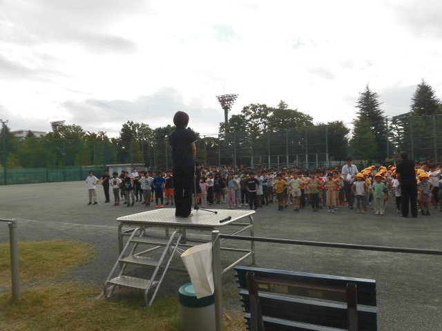 今日は校庭で全校朝会がありました。雲の合間から夏のような日差しが出ることがありました。全校朝会を校庭で行うと、今の季節を強く感じることができます。