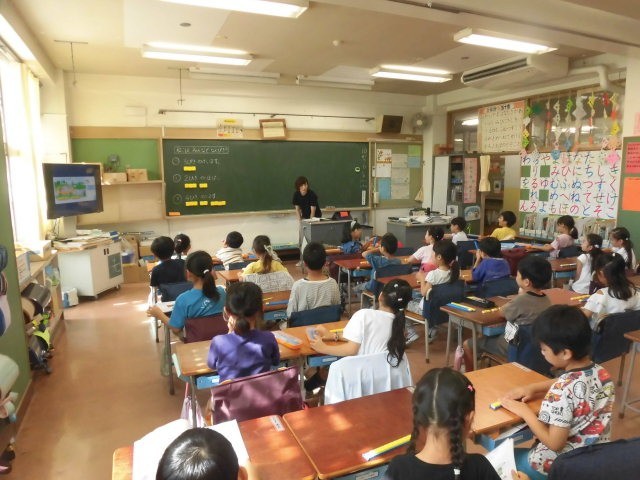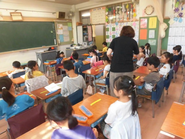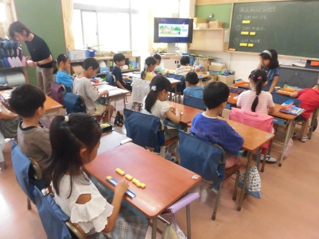子どもたちはブロックを使って考えています。今日は、それを式にする学習です。ブロックを使ったあとは、子どもたちはノートに式を書き始めました。