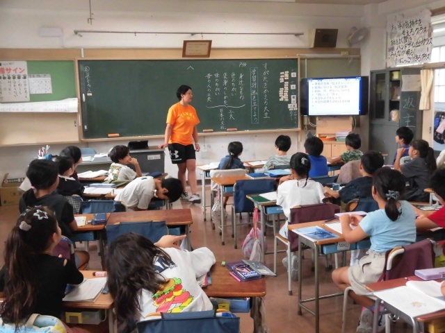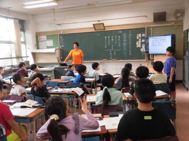教室に入るといきなり質問をされました。「大豆が姿を変えたものでは何が好きですか。」そう聞かれ、「豆腐」と迷わず答えました。しょうゆなど何もつけずに食べることを伝えると、子どもたちみんなにびっくりされてしまいました。