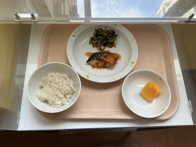 牛乳・麦ご飯・鯖の味噌煮・野菜の磯和え・果物(柿)
