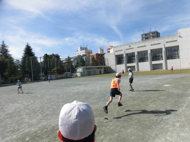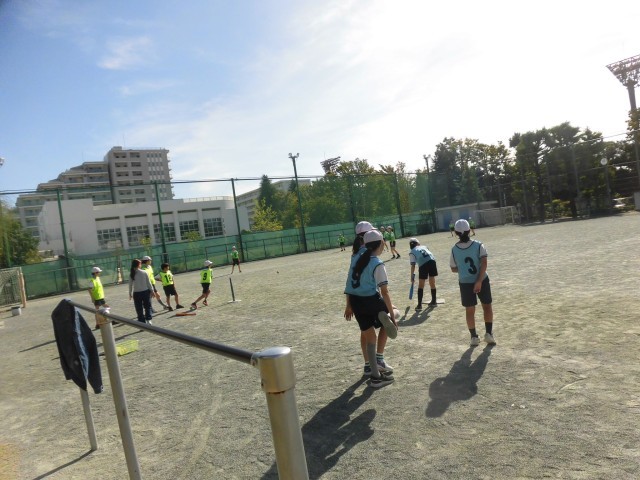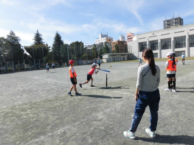 6年生の授業は体育です。ティーボールをしています。得意な人が、苦手な人にうち方や打ったら良い方向を教えてあげています。
