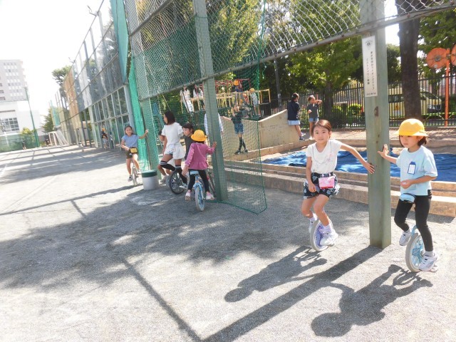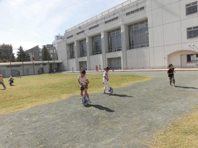 今日は子どもたちと一輪車で遊びました。8人で横に並び手をつないで校庭のはじまで行くことができました。新記録です。新記録が出ると嬉しいです。