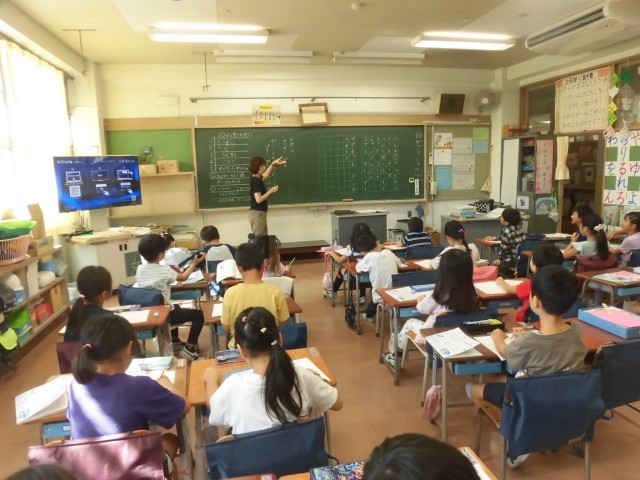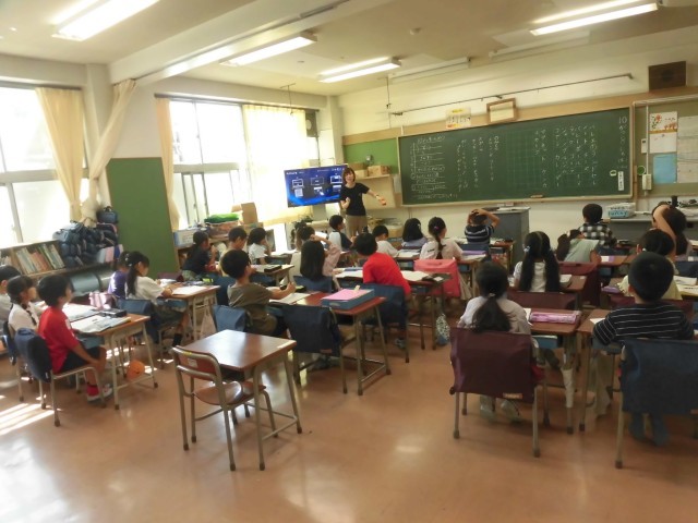1年生の授業は国語です。カタカナの授業です。カタカナで書く言葉はどのような言葉なのかを考えています。「スポーツにたくさんある。」「飲み物にも多いい。」そんな声があがっています。