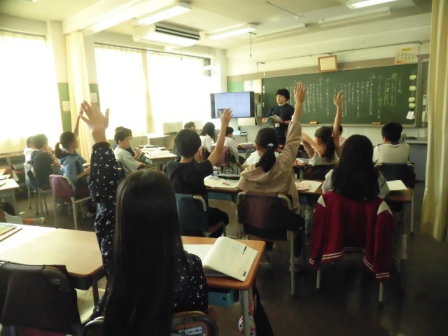 最後、ごんが撃たれてしまったとき、ごんはどんな思いだったのでしょう。いつになってももう一度読んでみたい物語です。子どもたちは、一生懸命に手を挙げて自分の意見を発言しようとしていました。