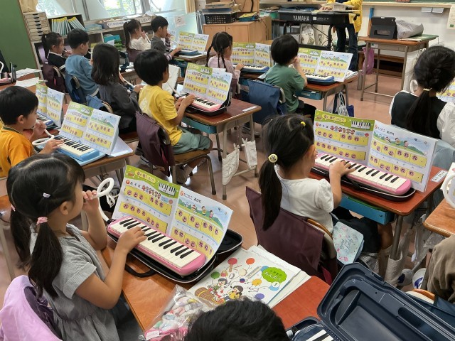 学芸会で歌う「まくを開ける歌」を歌った後に、鍵盤ハーモニカを吹きました。