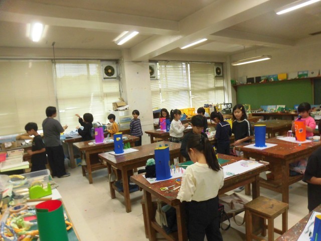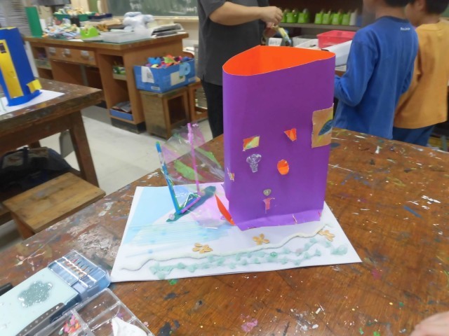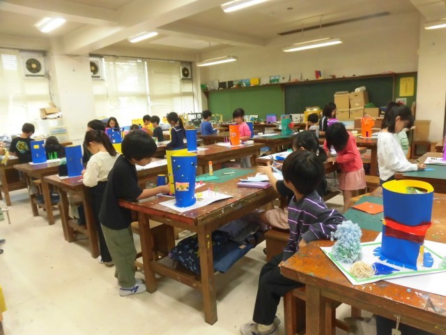 子どもたちがカラー工作用紙を使って筒状の家をつくっています。そこにカッターで窓を切り抜き、装飾を加えています。カーテンをかけている人もいます。窓の中から動物がのぞいているものもあります。とても楽しい作品ばかりです。