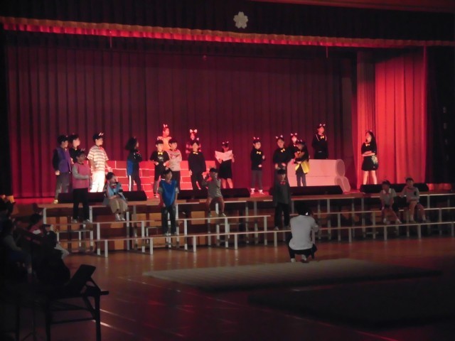 明日の児童鑑賞日の前、最後の練習です。今日は、写真屋さんも来て、子どもたちの写真を撮っています。そのカメラのフラッシュを感じてか、子どもたちも緊張しているように見えます。役になり切ろうと頑張っている3年生です。