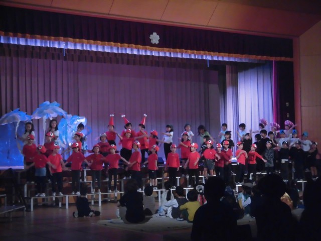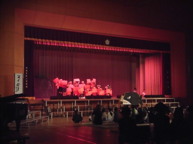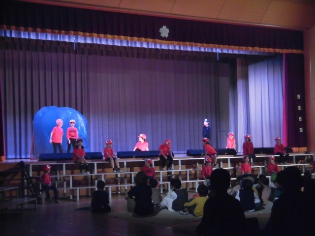 2年生の演目は「スイミー」です。たくさんの魚たちが大きなマグロに立ち向かいます。一生懸命に役になり切りセリフを言う2年生の姿がとてもすてきです。