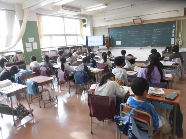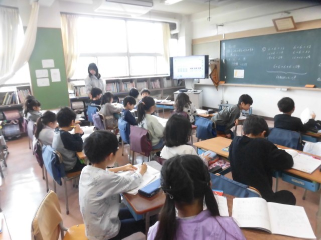 2年生の授業は算数です。かけ算の学習です。子どもたちは一人ひとり問題を解いています。