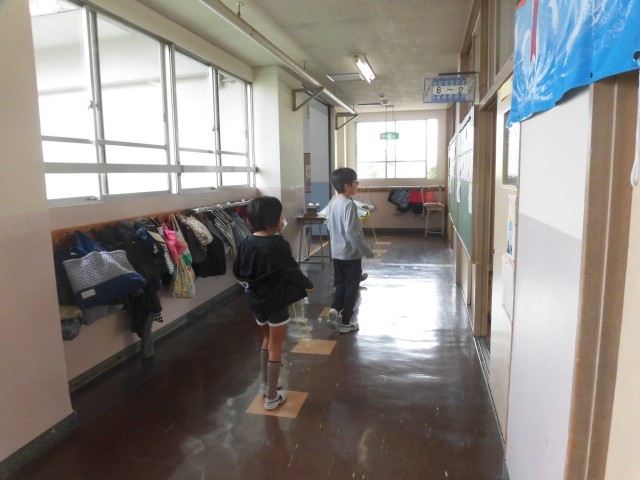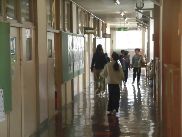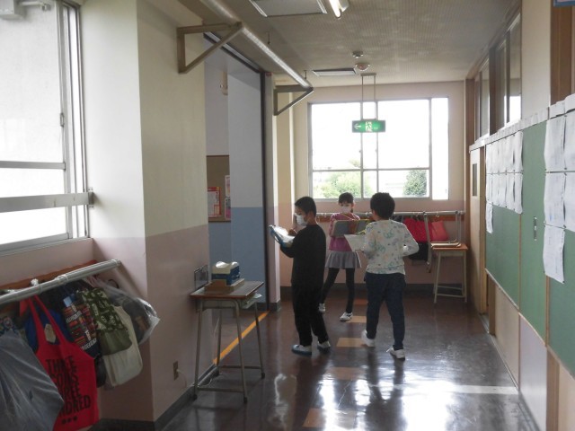 3年生の授業は社会です。校内の消防設備を探して、グループで校内をまわっています。