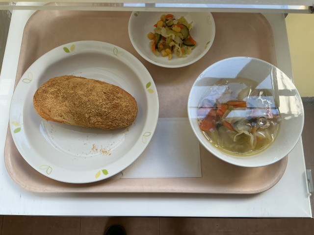 牛乳・きなこ揚げパン・ガーリックサラダ・ベーコンと野菜のスープ