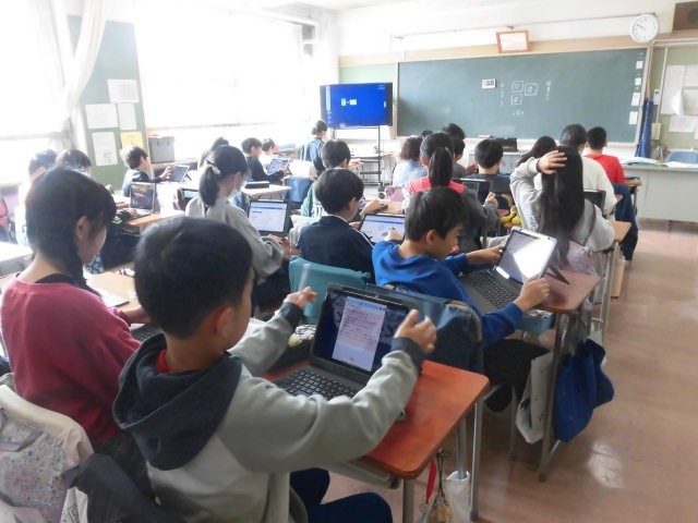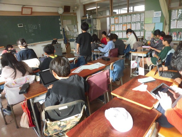 5年生の授業は国語です。学校生活での改善点などを自分で考え、それに対しての取り組みを作文にします。要点を書き出し、タブレットで書き込んでいます。静かに学習を進めてる5年生です。