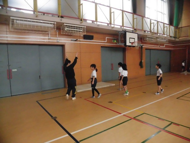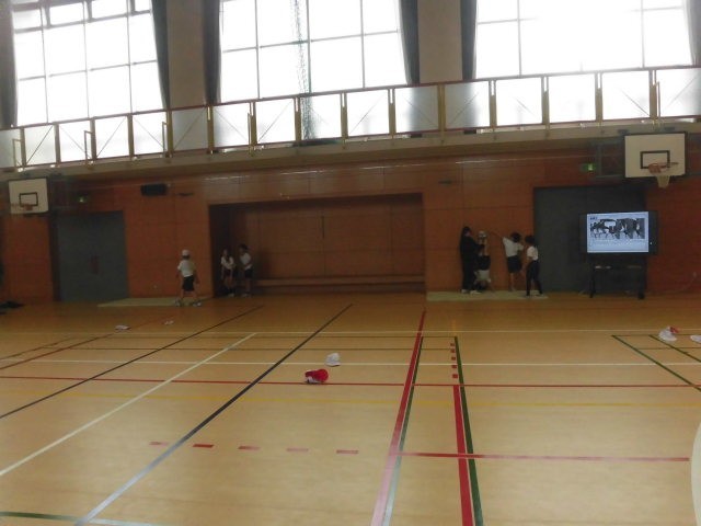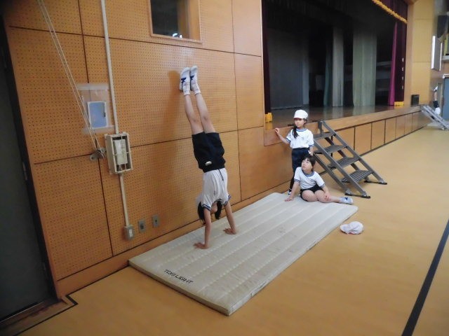 3年生の授業は体育です。マットの学習です子どもたちは補助倒立の練習をしています。壁をつかったり、肋木をつかったりして練習をしています。子どもたちは、ポイントをモニターで確認しながら取り組んでいます。両手でしっかりと身体を支え、身体に力を入れしっかりと補助倒立ができている人がいます。とてもかっこよいです。