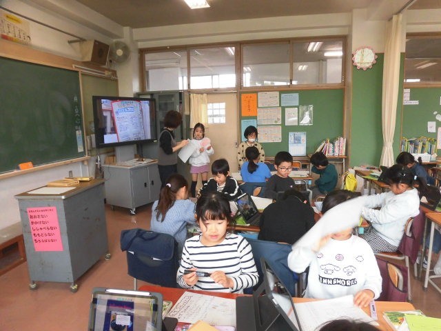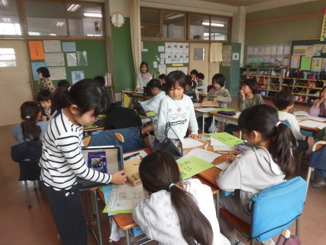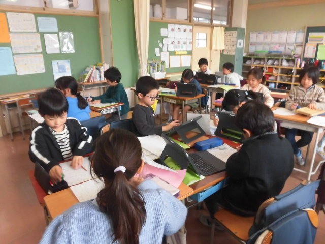 2年生の授業は生活です。まちたんけんでまわった地域のお店や施設についての紹介文を作成しています。撮ってきた写真やその場でとったメモをもとに文章を作っています。見てきたお店や施設について私にも嬉しそうに教えてくれる2年生です。
