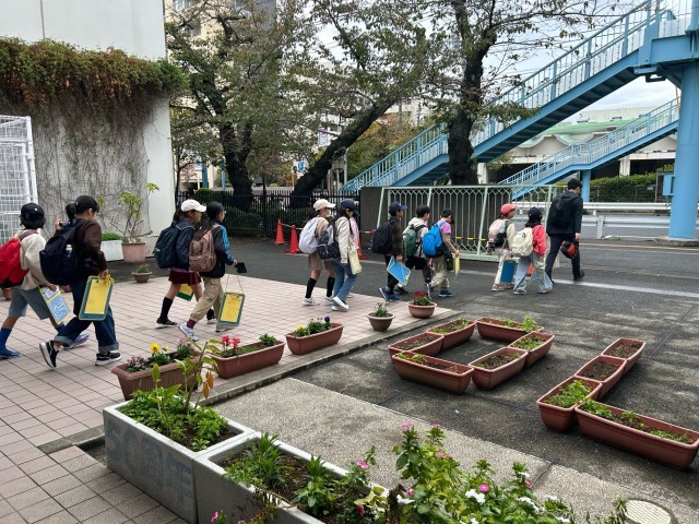 4年生がピロティに集まり、社会科見学に出発します。集まっていたことがわからないくらい、静かに待っていた4年生です。