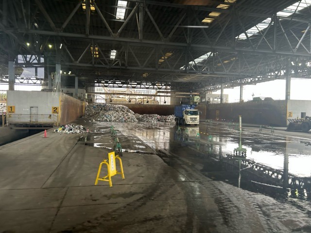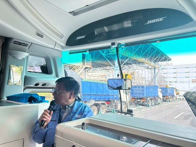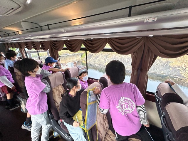 バスに乗って処理場や埋立処分場の見学です。いろいろな処分場の様子やゴミや灰を埋め立てる様子をバスの中から見学しました。処分場の土中を通る雨水の貯水場は、真っ黒でした。それも、浄水するそうです。