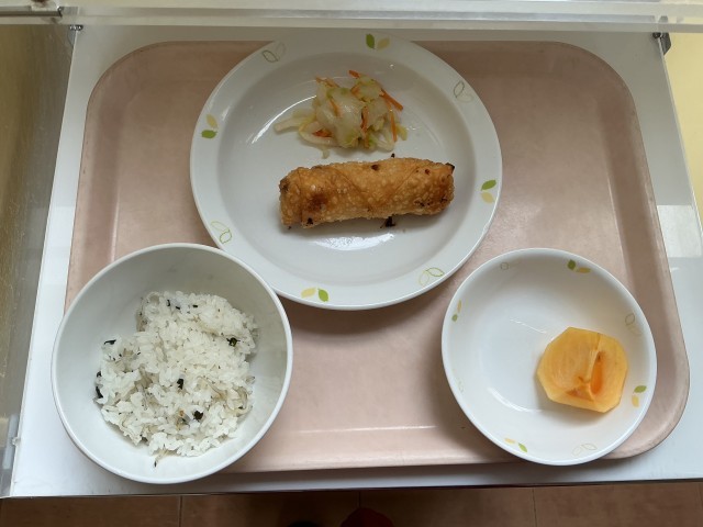 牛乳・わかめとじゃこのご飯・春巻き・ラーパーツアイ・果物(柿)