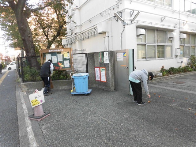 子どもたちの登校する時刻です。早く登校した4年生は、主事さんのお仕事の手伝いをしています。主事さんも嬉しそうです。
