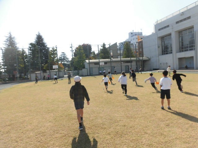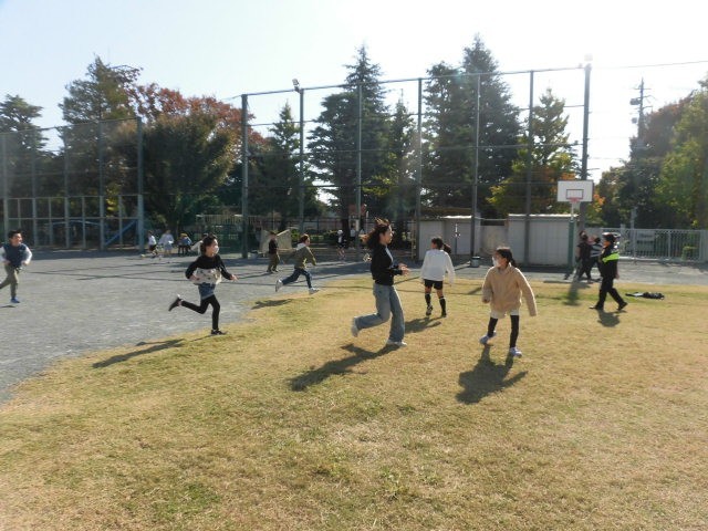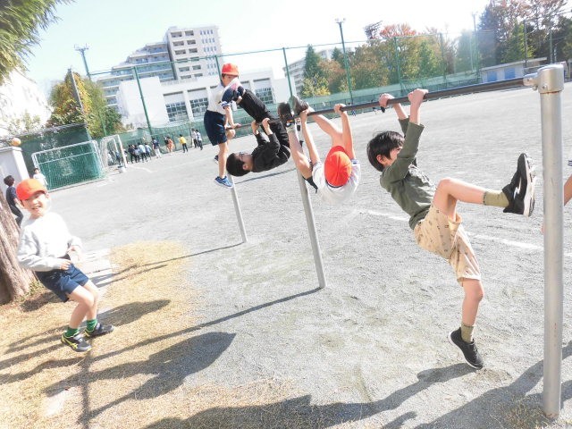 中休みの子どもたちの様子です。子どもたちが校庭を走り回っています。大きなトノサマバッタを見つけた子どもたち、しばっちの向こうに跳んで逃げようとしています。それを一斉に子どもたちが走って追いかけています。結局、トノサマバッタは、バスケットボールをして遊んでいた先生につかまえられてしまいしました。2年生が高い鉄棒で逆上がりをしています。すごいです。