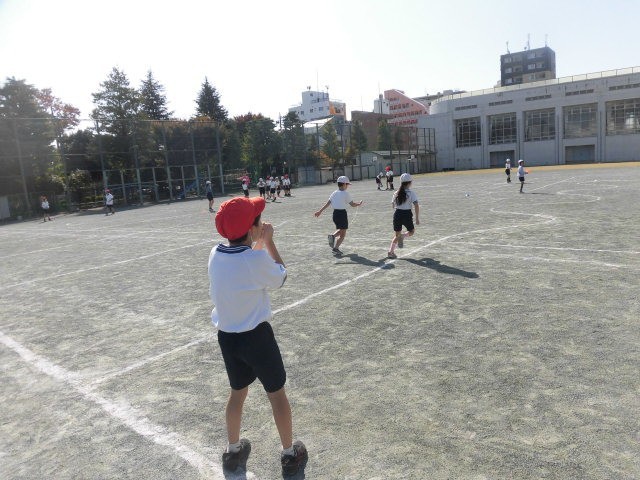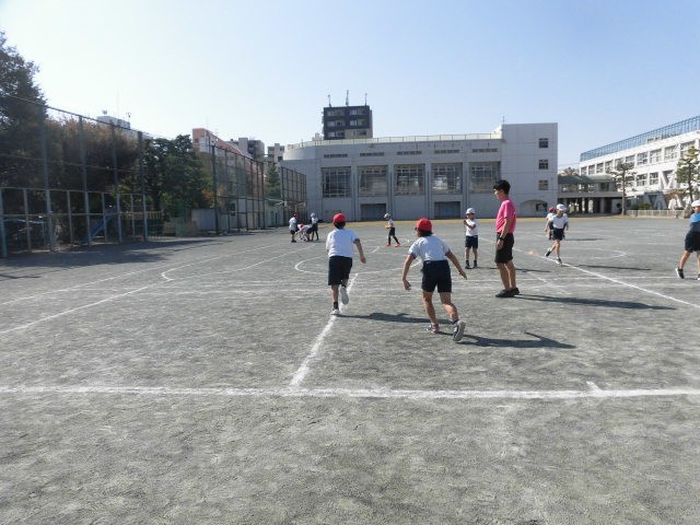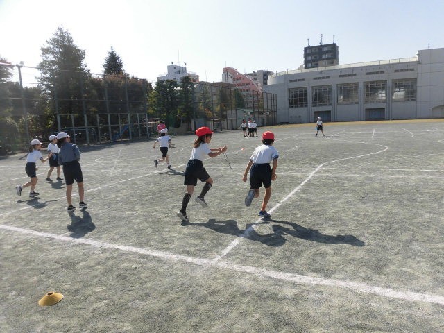 4年生の授業は体育です。ぐねぐね走をしています。ぐねぐねしたコースを速く走るためにはどうしたらよいでしょう。子どもたちは身体の使い方を考えています。友達と見合い学習をして、アドバイスをしあっている4年生です。