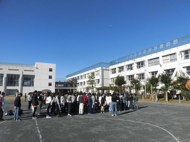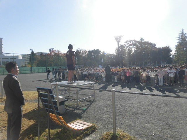 今日は全校朝会がありました。気持ちのよい青空の下での朝会です。