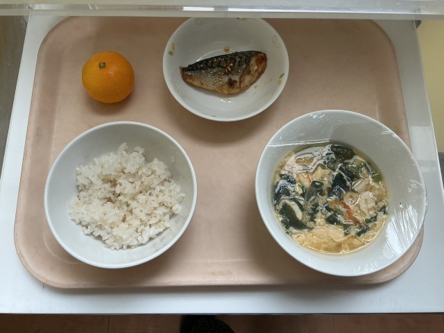 牛乳・麦ご飯・鯖の一味焼き・かきたま汁・果物(みかん)