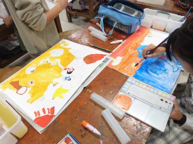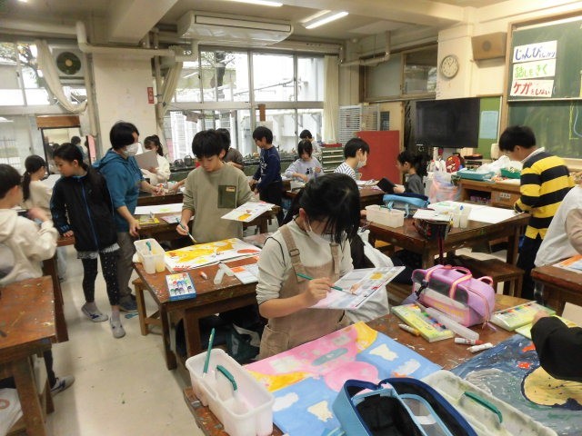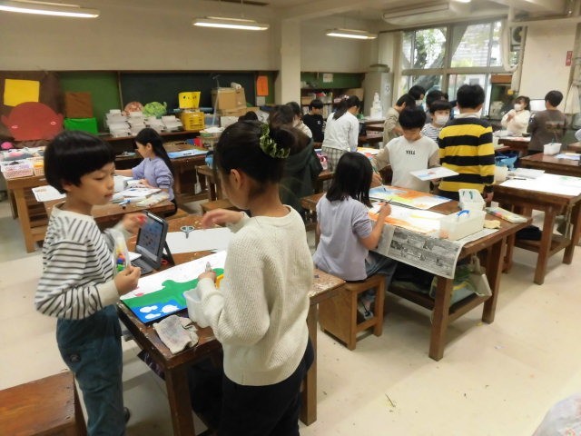 4年生の授業は図工です。「へんてこ山」と題して、かわった形の山を描き、そこにいろいろな世界を描き加えています。