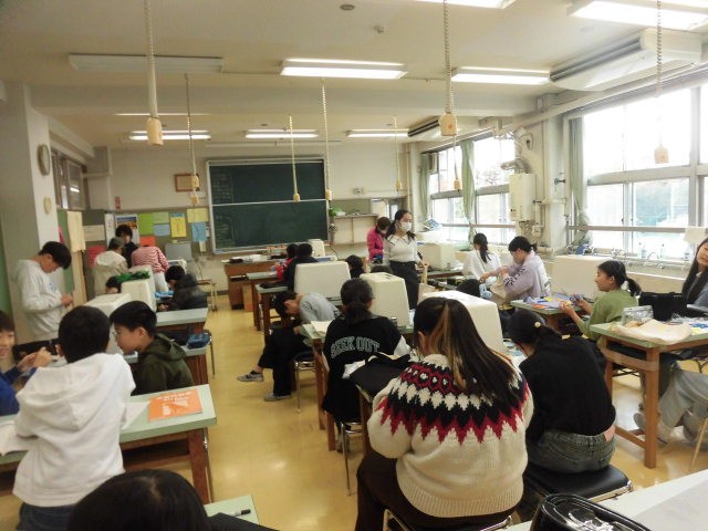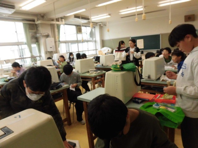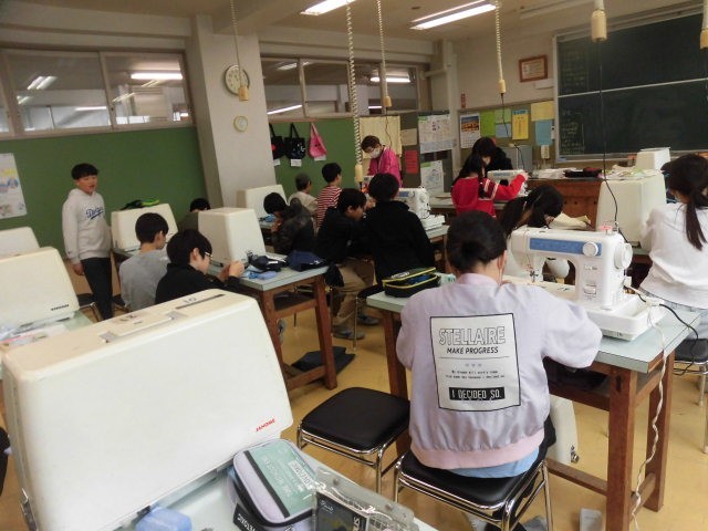 マイバックをつくっています。ミシンを使って縫っている人、フェルトで飾りをつくっている人など一人ひとりの作業は異なります。ミシンや針を使っての授業、安全には十分気を付けてほしいです。