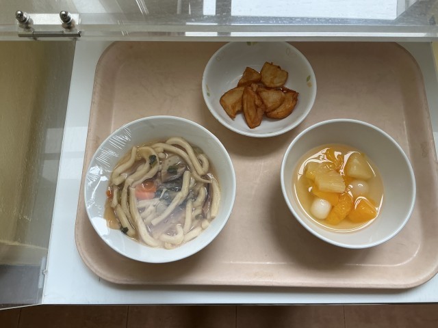 牛乳・ちゃんこうどん・みそポテト・フルーツ白玉