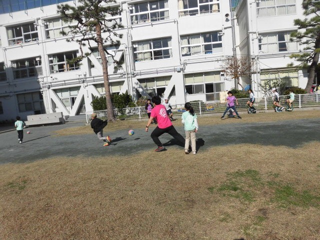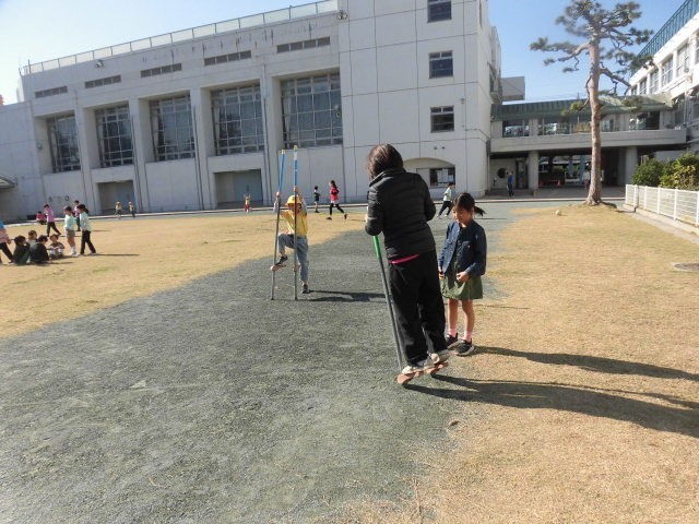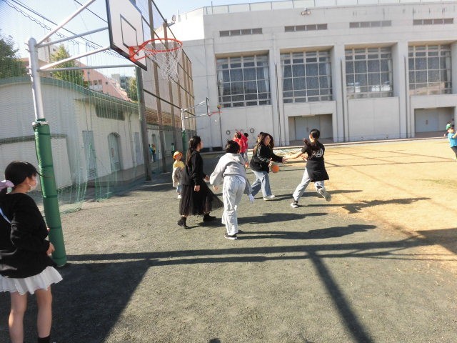6年生がバスケットボールをしています。最近、バスケットボールのゴールを使って遊ぶ人たちがたくさんいます。最近までバスケットゴールがなかったので、バスケットが好きな人たちが我慢をしていたのでしょう。バレーボールや一輪車、竹馬などいろいろな遊びをしている子どもたちです。